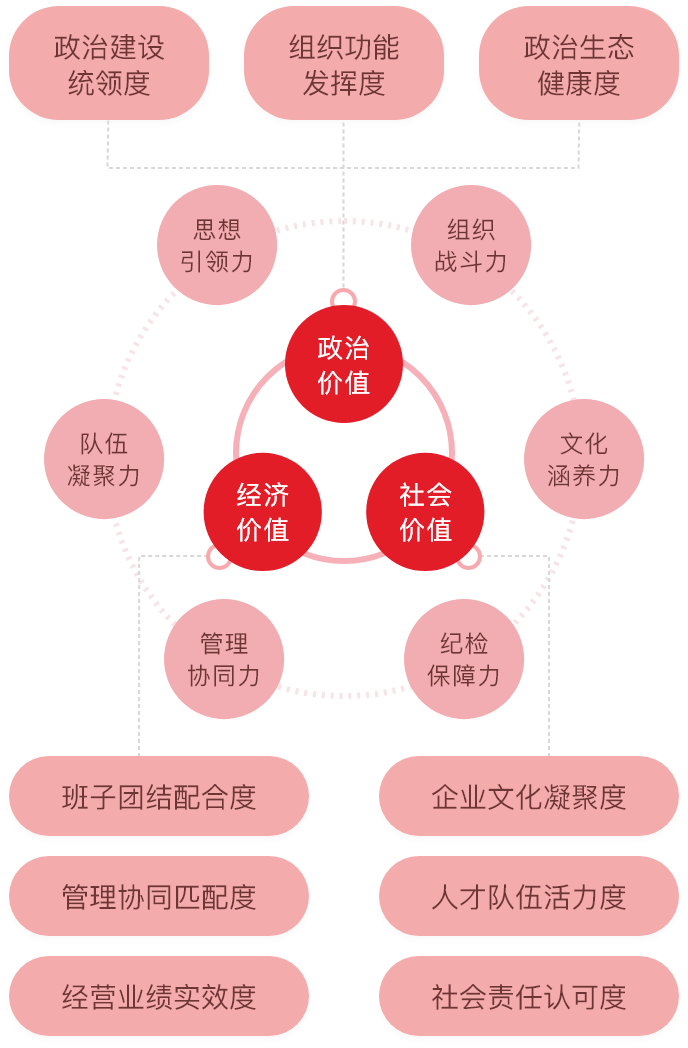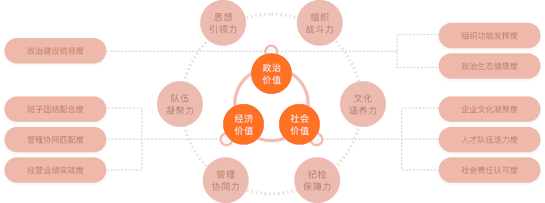 “价值党建”——即国有企业党建工作要紧紧围绕国企政治、经济、社会“三个责任”,牢固树立价值导向,以做强做优做大国有企业为目标,通过党建工作与生产经营“双向嵌入、互相融合”,充分发挥企业党组织把方向、管大局、保落实作用,最大程度上激发党建工作效能和价值创造能力,不断引领企业高质量发展,确保国有企业成为我们党赢得具有许多新的历史特点的伟大斗争胜利的重要力量。“价值党建”核心理念是:“三个价值”、“六个路径”和“九个维度”。